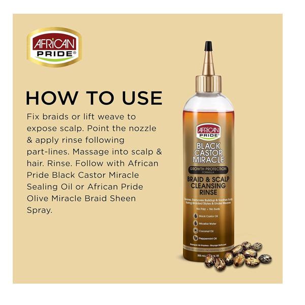 HOW TO USE – Fix braids or lift weave to expose scalp. Point the nozzle & apply rinse following part-lines. Massage into scalp & hair. Rinse. Follow with African Pride Black Castor Miracle Sealing Oil or African Pride Olive Miracle Braid Sheen Spray.