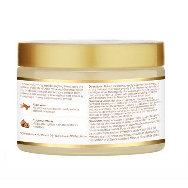 African Pride Moisture Miracle Pre-Shampoo is a conditioning treatment that leaves hair soft and manageable during cleansing and styling. It’s a moisture-rich blend that uses the natural benefits of aloe Vera and coconut water to condition and protect natural coils and curls from breakage and aids in minimizing and removing tangles and knots. The aloe Vera found in this 12 oz African Pride Moisture Miracle shampoo nourishes and conditions the hair, while the coconut water strengthens and moisturizes. The combination keeps curly hair tame, strong and ready for the next style.