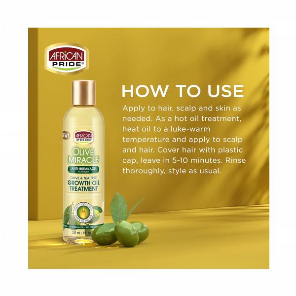 Use regularly to help stop breakage, split-ends, and dryness. African Pride olive miracle growth oil is excellent for skin, body, and nail health. Growth oil is also great as a hot oil treatment.