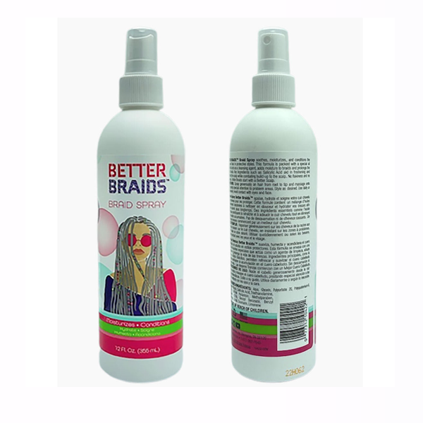 • Better Braid Spray soothes, moisturizes, and conditions the scalp and hair in protective styles.