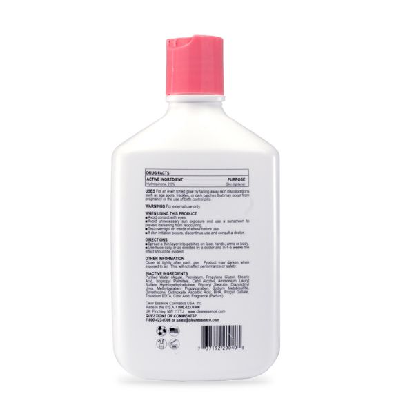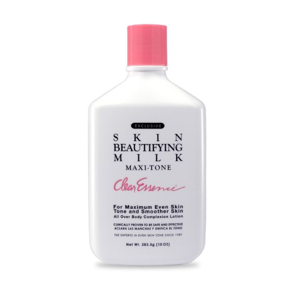 Clear Essence® Exclusive Skin Beautifying Milk … Now in A Larger, Modern Bottle! Moisturize the skin with both oil and water while achieving an even toned glow by fading away skin discolorations such as age spots, freckles, or dark patches that may occur from pregnancy or the use of birth control pills. Gradually fades skin discolorations with a high-potency formula containing hydroquinone. Now in a larger 10oz. container preventing the need for constant repurchasing!