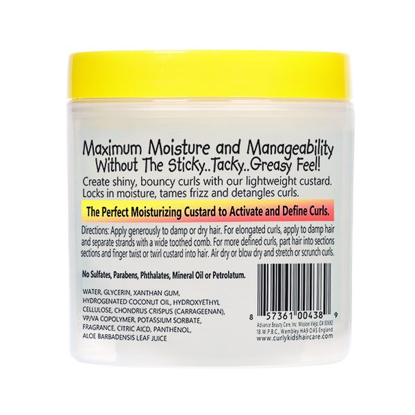 Curly Chic Your Curly Custard is with Maximum moisture and manageability without the sticky, tacky, greasy feel. No Sulfates, Parabens, Petrolatum or Mineral Oil. Infused with Coconut Oil and Aloe Vera leaf Juice.