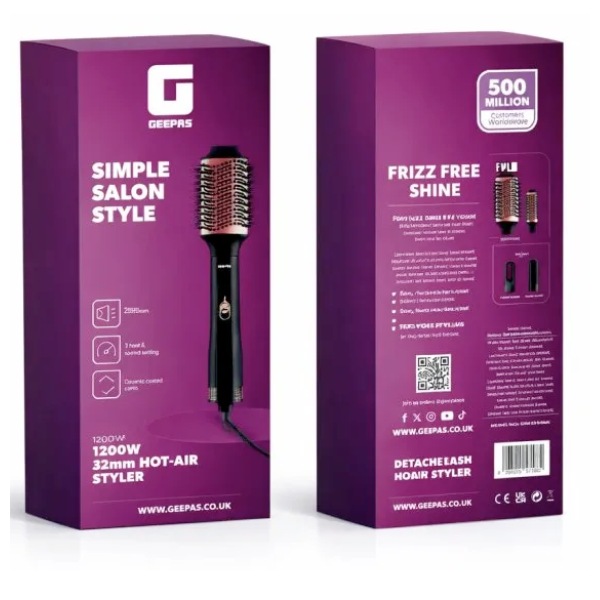 Achieve flawless, salon-quality hair at home with the Geepas 3-in-1 hot air styler, your ultimate tool for drying, styling, and volumizing with ease. This innovative hair styler combines the power of a high-performance hair dryer with the precision of advanced styling tools, making it perfect for creating sleek straight styles, voluminous curls, or effortlessly drying your hair.