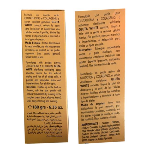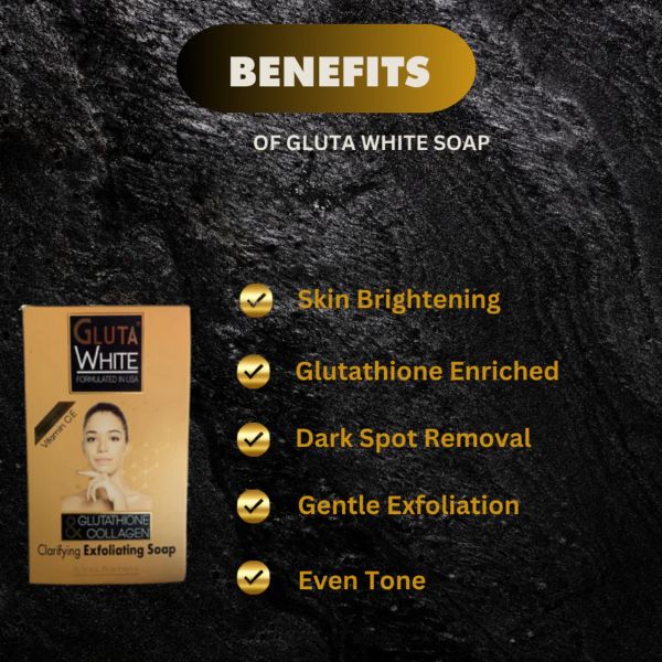 Gluta white soap Formulated with double actives GLUTATHIONE & COLLAGEN, GLUTA WHITE clarifying exfoliating soap smooths, cleans the skin without drying and rids of all dead cells. it purifies and eliminates stain and imperfection. for all skin types