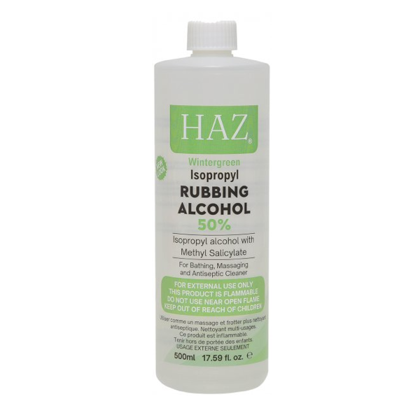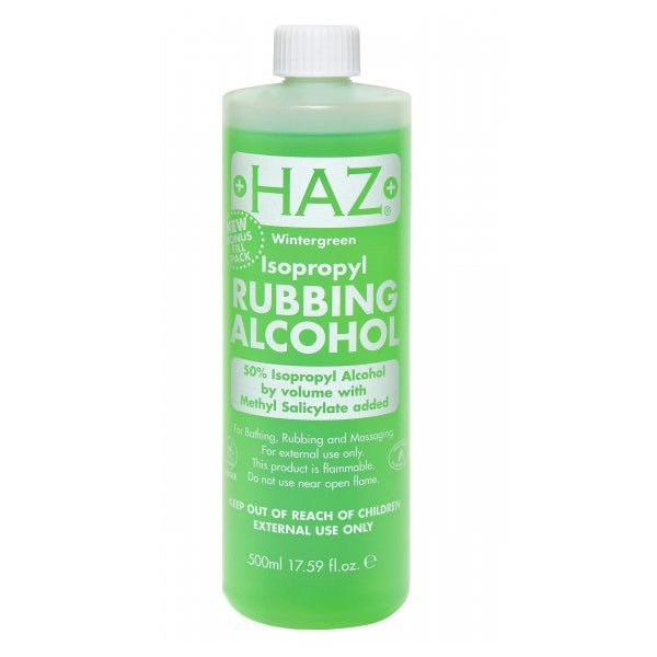 HAZ Wintergreen Isopropyl Rubbing Alcohol is 50% Isopropyl Alcohol by volume with Salicylate added. For bathing, rubbing and massaging.