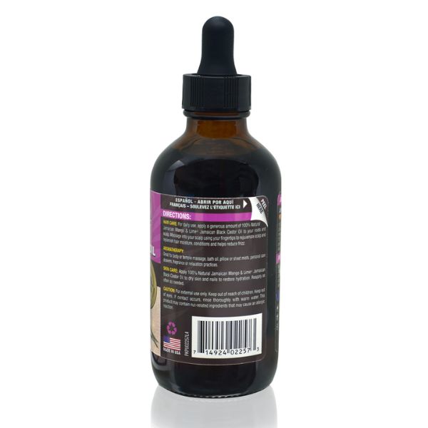 Jamaican Mango & LimeĀ® Jamaican Black Castor Oils are powerful all-purpose soothing oils roasted and ground manually. Jamaican castor beans are then boiled to produce 100% pure organic oil. These pure and unrefined oils retain their nutritive properties, making them great for skin softening, moisturizing massage oils, or hot oil treatments for dry, damaged hair