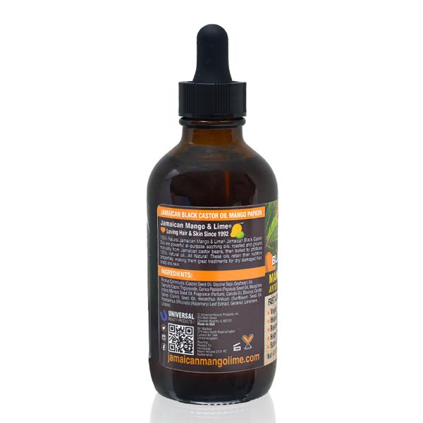 Jamaican Black Castor Oil Mango Papaya are powerful all-purpose soothing oils roasted and ground manually from Jamaican castor beans, then boiled to produce 100% pure castor oil. These pure and unrefined oils retain their nutritive properties, making them great for skin softening, moisturizing massage oils, or hot oil treatment for dry, damaged hair.