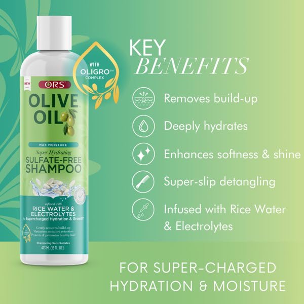 ORS Olive Oil Max Moisture Sulfate-Free Shampoo delivers super hydrating results for natural and relaxed hair. Gently but thoroughly cleanses and removes build-up while providing superior hair hydration restores moisture and nourishment to strands and promotes healthy hair with Rice Water, Electrolytes, Olive Oil and proprietary Oligro™ Complex. The ultimate collection for supercharged hydration. The electrolyte-infused formula is the HIIT of hydration for your hair and scalp. It instantly replenishes and recharges for Max Moisture. Shake well before using until its uniformly mixed.